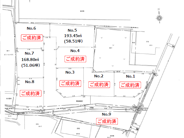 | 備考 | ※土地面積は予定面積であり、確定測量後に変更となる場合があります。 ※宅地内に電柱及び支線の設置予定がございます(2,3,5,8,9号地) |