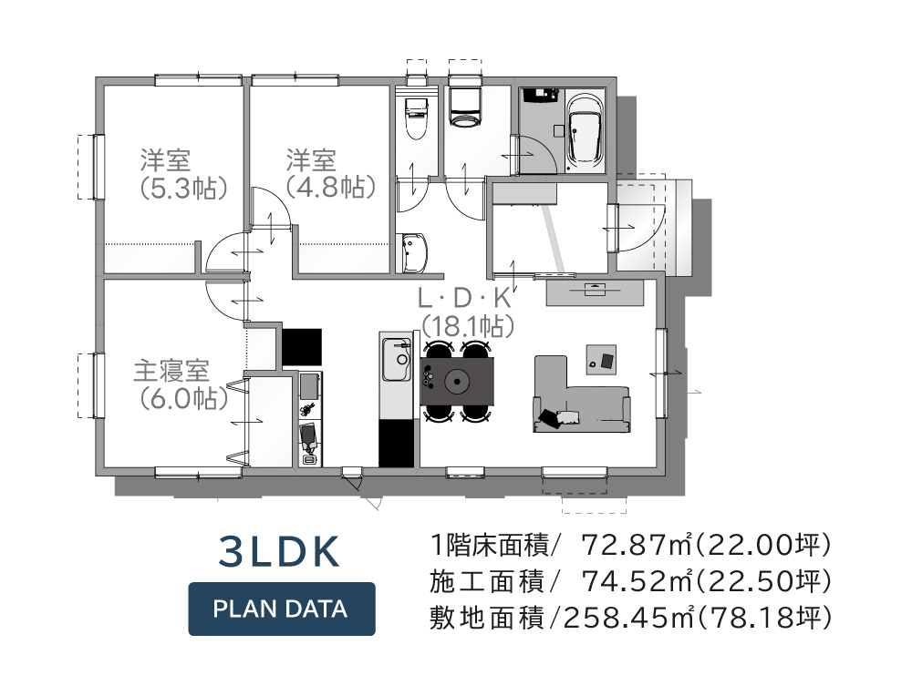 - LDKから全ての部屋へアクセスできるスムーズな動線。 コンパクトでも広がりを感じるリビング中心の間取りが、家族の時間をやさしくつなぎます。