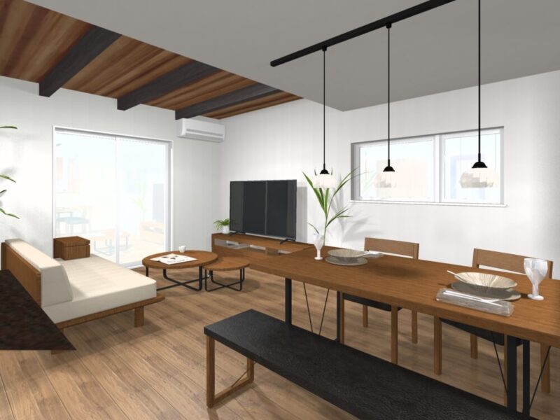 さらに梁&木調クロスで仕上げ、家族のリラックス空間を演出。